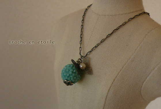 トルコ石のような色合いの花玉に、小さな蝶を繋げました。
